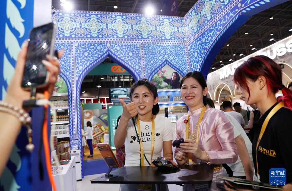 4月13日,主播在第六届消博会一处海外商品展台直播。新华社记者 高静 摄