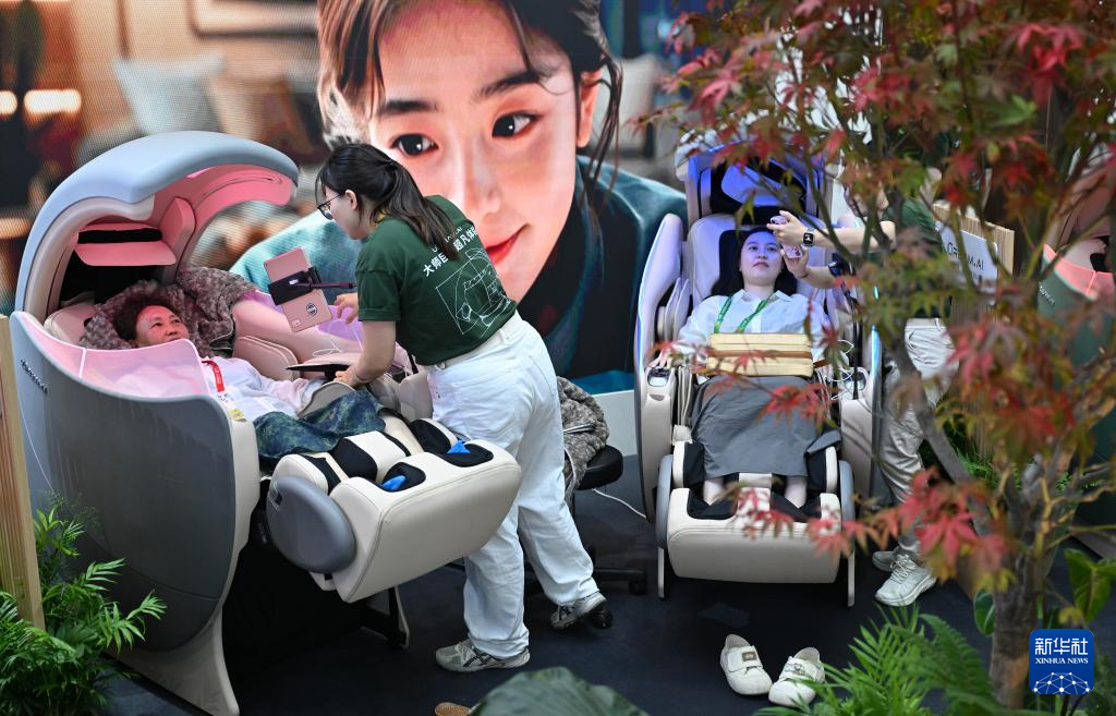 4月13日,参观者在第六届消博会现场体验按摩椅。新华社记者 郭程 摄