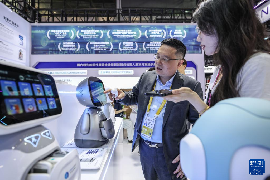 4月13日,参观者在第六届消博会现场了解一款康养陪伴机器人。新华社记者 郭程 摄